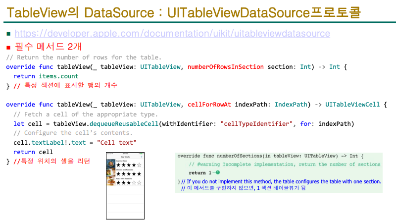 UITableViewDataSource프로토콜을 사용할 때에는 필수 메서드가 두가지가 있고 나머지는 선택 프로토콜이 있어요