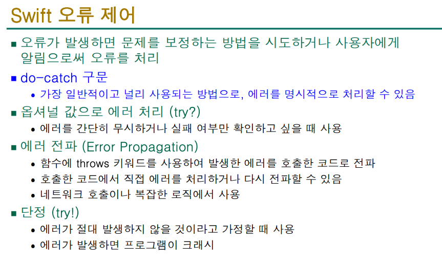 // - x가 nil일 때: 값이 없는데 강제로 꺼내려고 했으므로, **런타임 에러(Fatal error: Unexpectedly found nil while unwrapping an Optional value)**가 발생하며 앱이 **강제 종료**됩니다. 매우 위험하므로 꼭 필요하고 값이 있음을 100% 확신할 때만 사용해야 합니다.