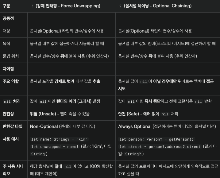 !)은 해당 옵셔널 변수에 절대로nil이 없다고 100% 확신할 수 있는 경우에만 제한적으로 사용해야 합니다. 일반적으로는 옵셔널 체이닝이나if let,guard let을 사용하는 것이 훨씬 안전합니다.