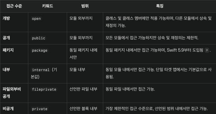 swift의 접근제어 에서는 대부분 internal이 생략되어있어요