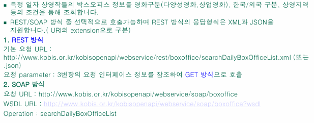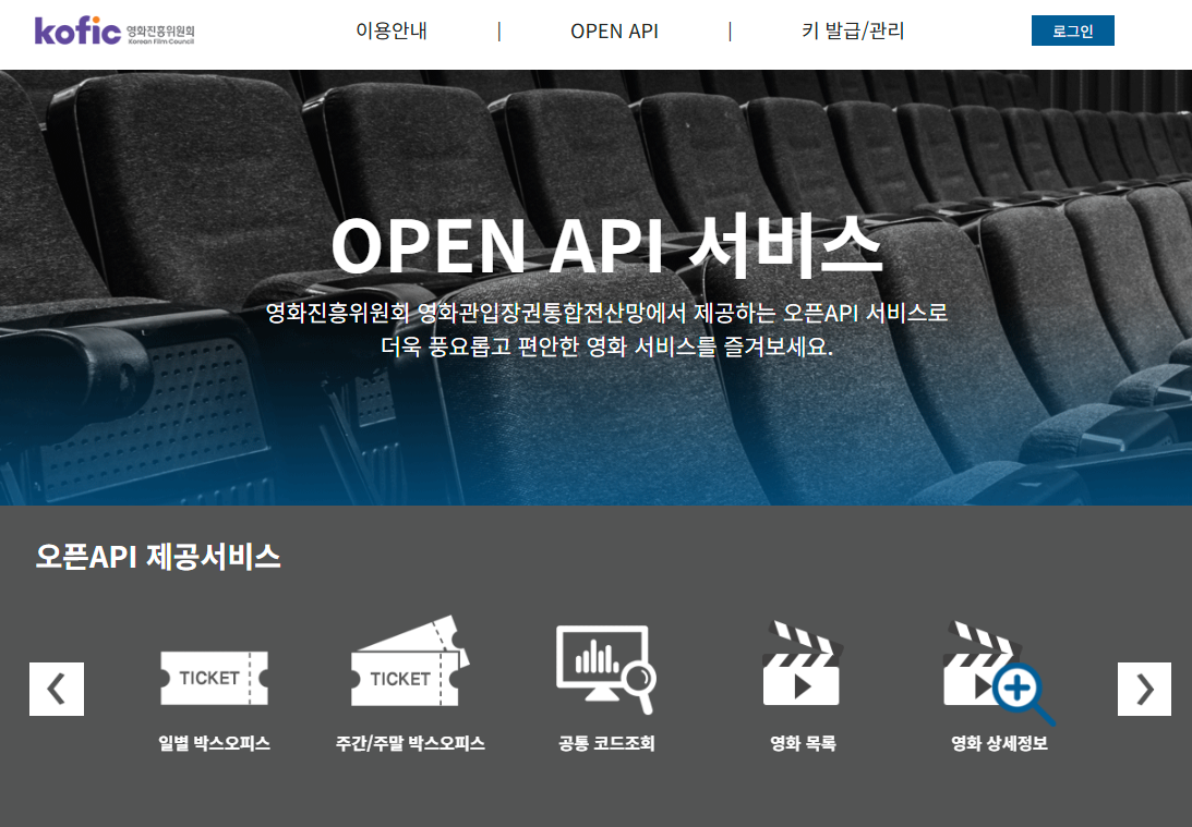 OPEN API 서비스 영화진흥위원회 영화관입장권통합전산망에서 제공하는 오픈API 서비스로 더욱 풍요롭고 편안한 영화 서비스를 즐겨보세요.