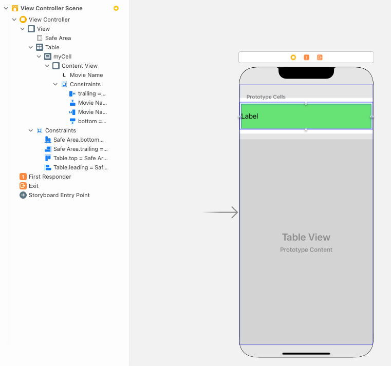 table view와 label에 대해 Constraints제약 조건을 설정해줘요