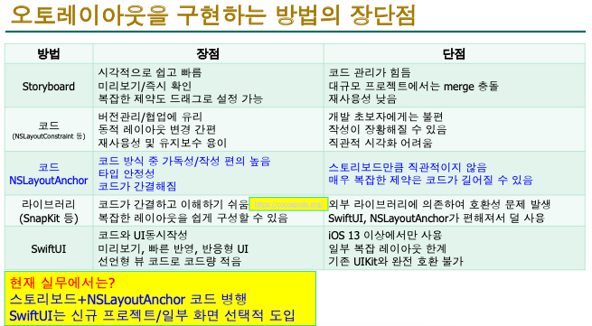 - 화면 크기가 각기 다른 iOS 기기 (아이폰, 아이패드 등)에서 UI(버튼, 레이블 등)가 잘 보이도록 위치와 크기를 '조건' 으로 지정해주는 레이아웃 시스템 입니다