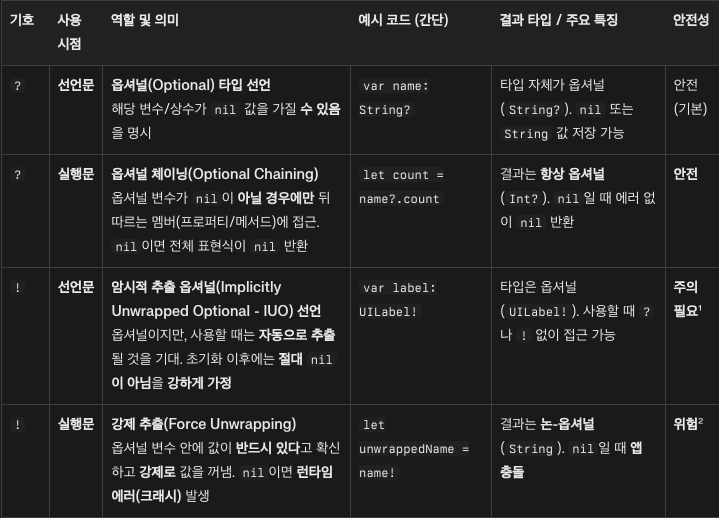 옵셔널 체이닝 (Optional Chaining)옵셔널을 언래핑하는 여러가지 방법Forced Unwrapping (강제 언래핑): 위험var x: String? = "Hi"x! // 만약 x가 nil이면 런타임 에러 발생Optional Binding (옵셔널 바인딩): 안전if let a = x { print(a) // x가 nil이 아닐 경우 a에 값이 할당됨}Nil Coalescing Operator (nil 병합 연산자): 안전let c = x ?? "" // x가 nil이면 빈 문자열이 할당됨Optional Chaining (옵셔널 체이닝): 안전let b = x?.count // x가 nil이면 b는 nil안전하고 간결한 코드의 비밀, 옵셔널 체이닝 (Optional Chaining)안녕하..